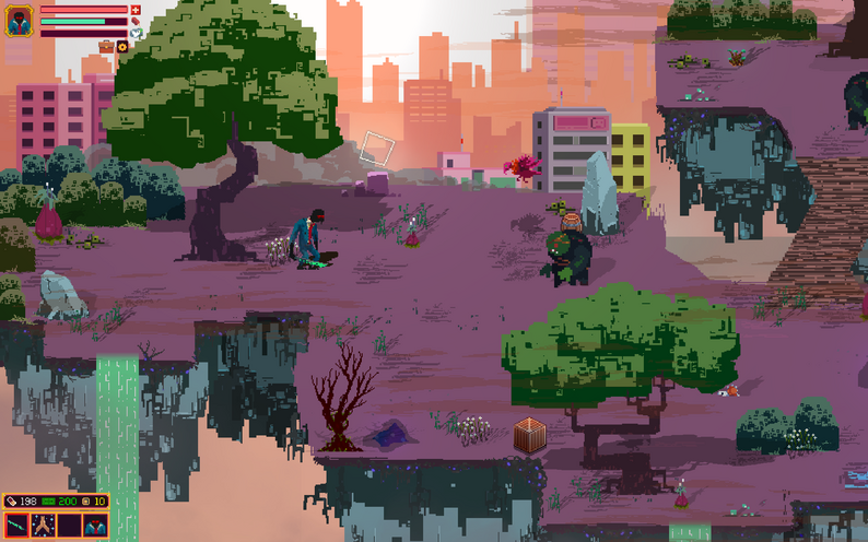 Engage in highly varied and diverse environments, featuring unique and large-scale eclectic pixel art.
